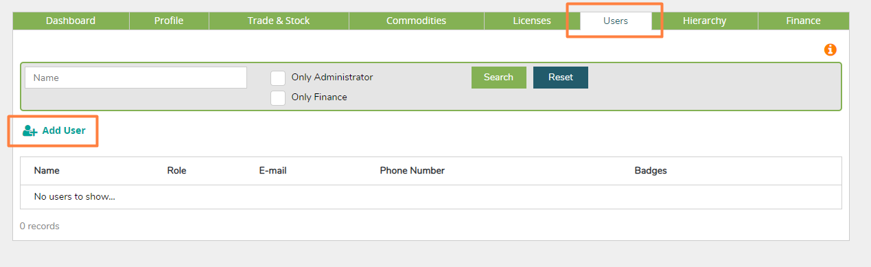 Seuls les utilisateurs administrateurs peuvent ajouter un nouvel utilisateur dans leur profil en cliquant sur +Add User (ajouter un utilisateur) sous l’onglet Users (utilisateurs). Veuillez noter que vous ne devez pas inscrire votre société si cela a déjà été fait par l'un de vos collègues sinon, cela créera des doublons.