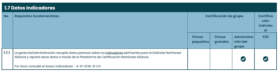 De acuerdo con el requisito 1.7.1, la gerencia de un grupo de fincas o de una finca certificada individualmente es responsable en última instancia de la recopilación de datos precisos y de la presentación de informes de puntos de datos a través de la Plataforma de Certificación de Rainforest Alliance (RACP). LOS ENTES DE CERTIFICACIÓN verifican y validan los datos del Titular del Certificado durante las auditorías y emiten no conformidades si es necesario.