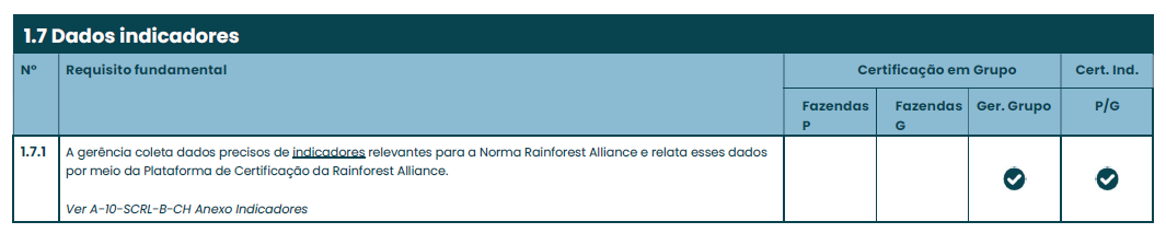 De acordo com o requisito 1.7.1, a gerência de um grupo de fazendas ou de uma fazenda certificada individualmente é, em última análise, responsável pela coleta de dados precisos e pelo relatório de pontos de dados por meio da Plataforma de Certificação Rainforest Alliance (RACP). As Entidades Certificadoras verificam e validam os dados do Detentor de Certificado durante as auditorias e emitem não conformidades se necessário.